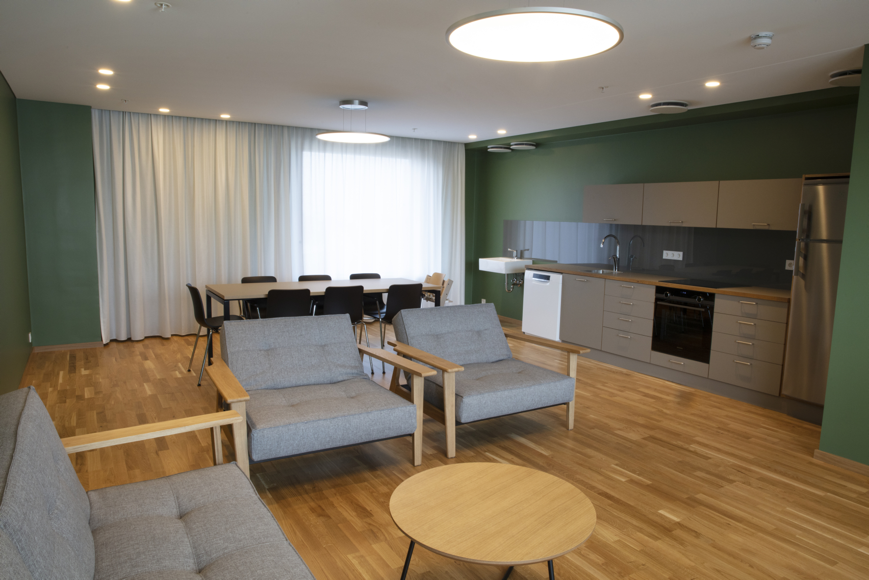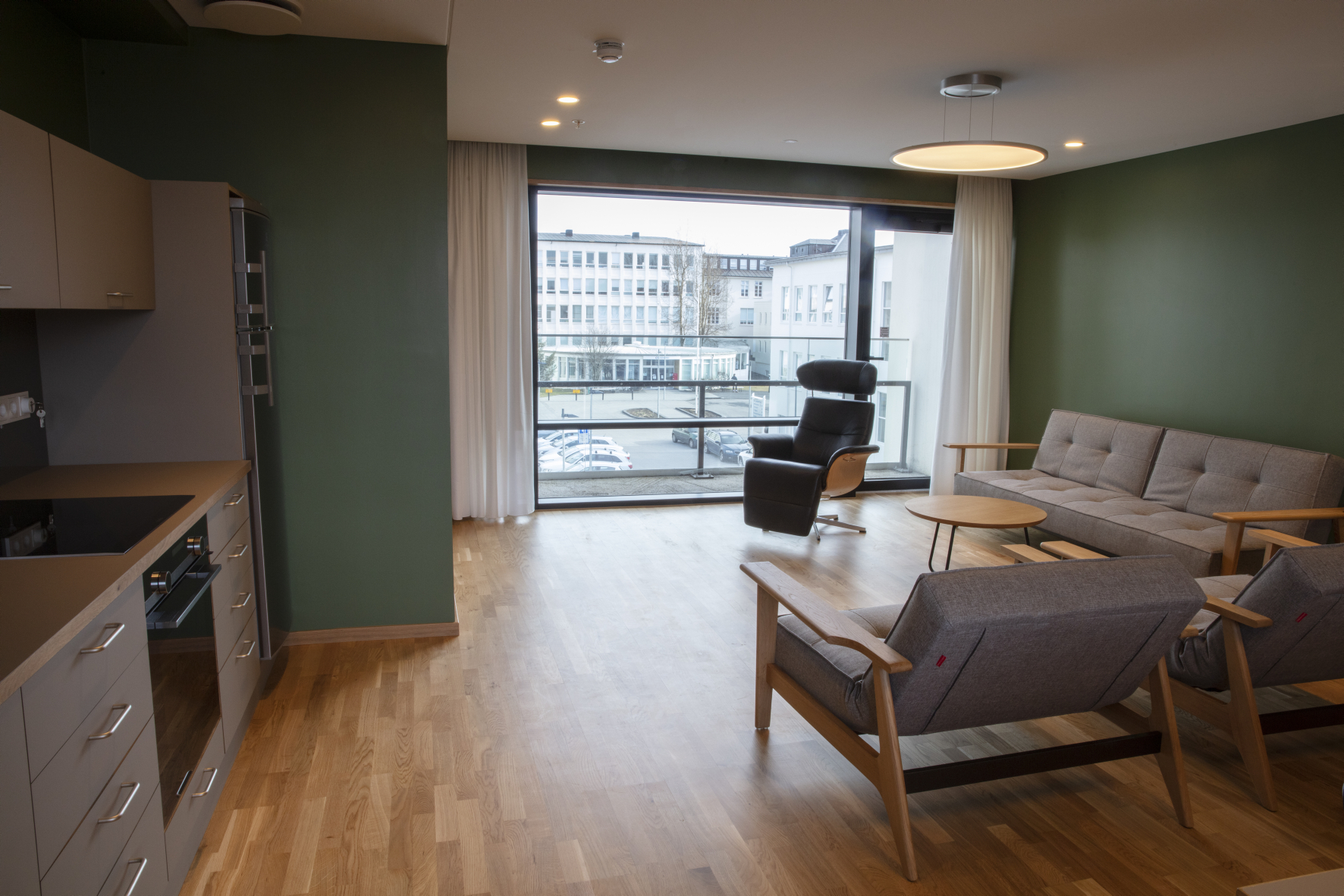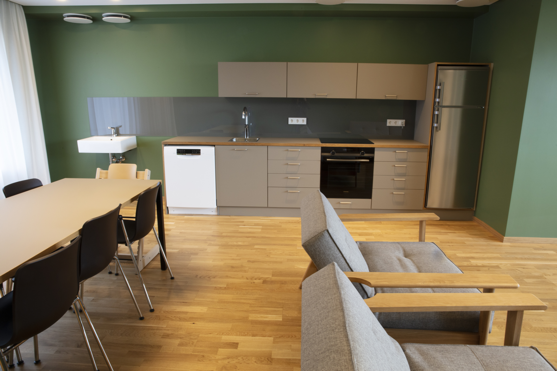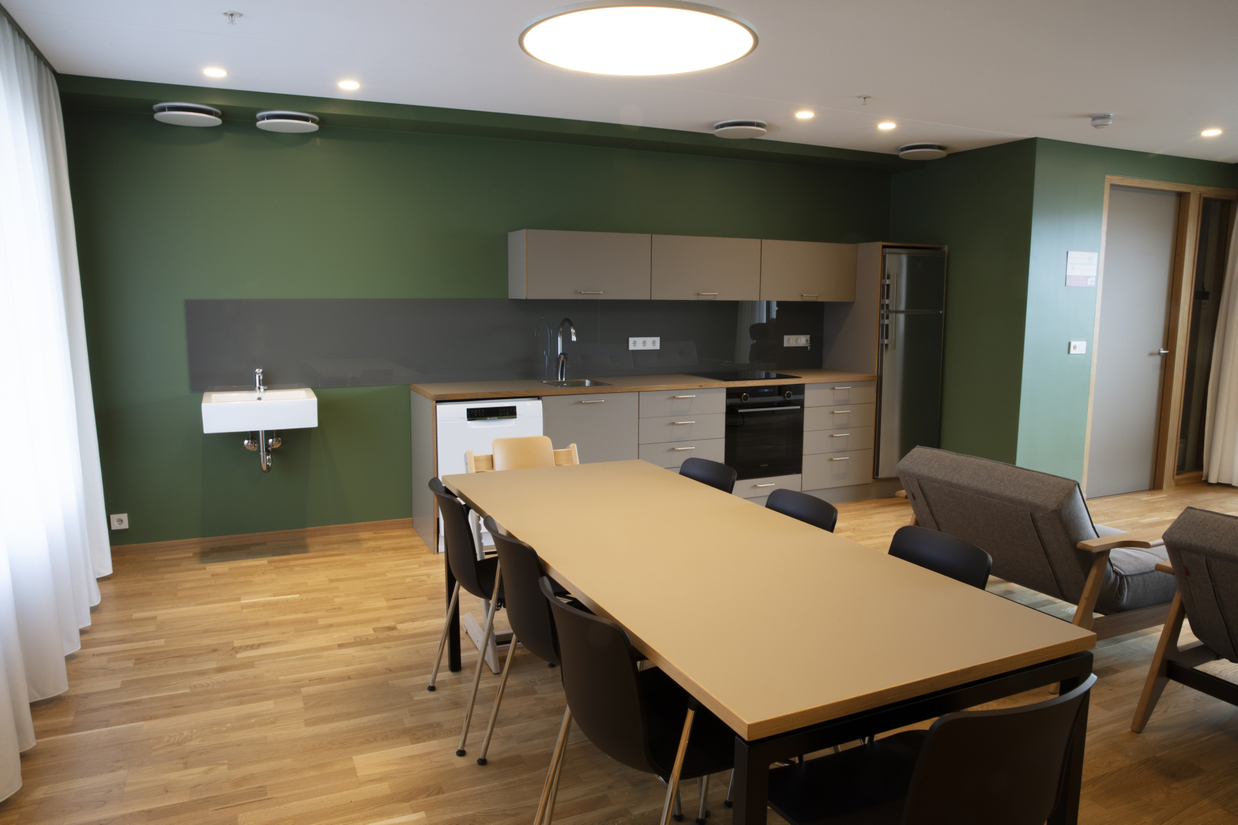 Á sjúkrahóteli eru tvær setustofur eða samvistarrými með eldhúskrók. Sólstofa er á 4. hæð með fallegu útsýni yfir borgina. Í eldhúskrók er örbylgjuofn, hitakanna, eldavél og ofn. Hótelsgestir eru beðnir að vanda umgengni á setustofum. Hótelsgestir ganga sjálfir frá og þrífa á setustofu eftir notkun hennar eins og við á.