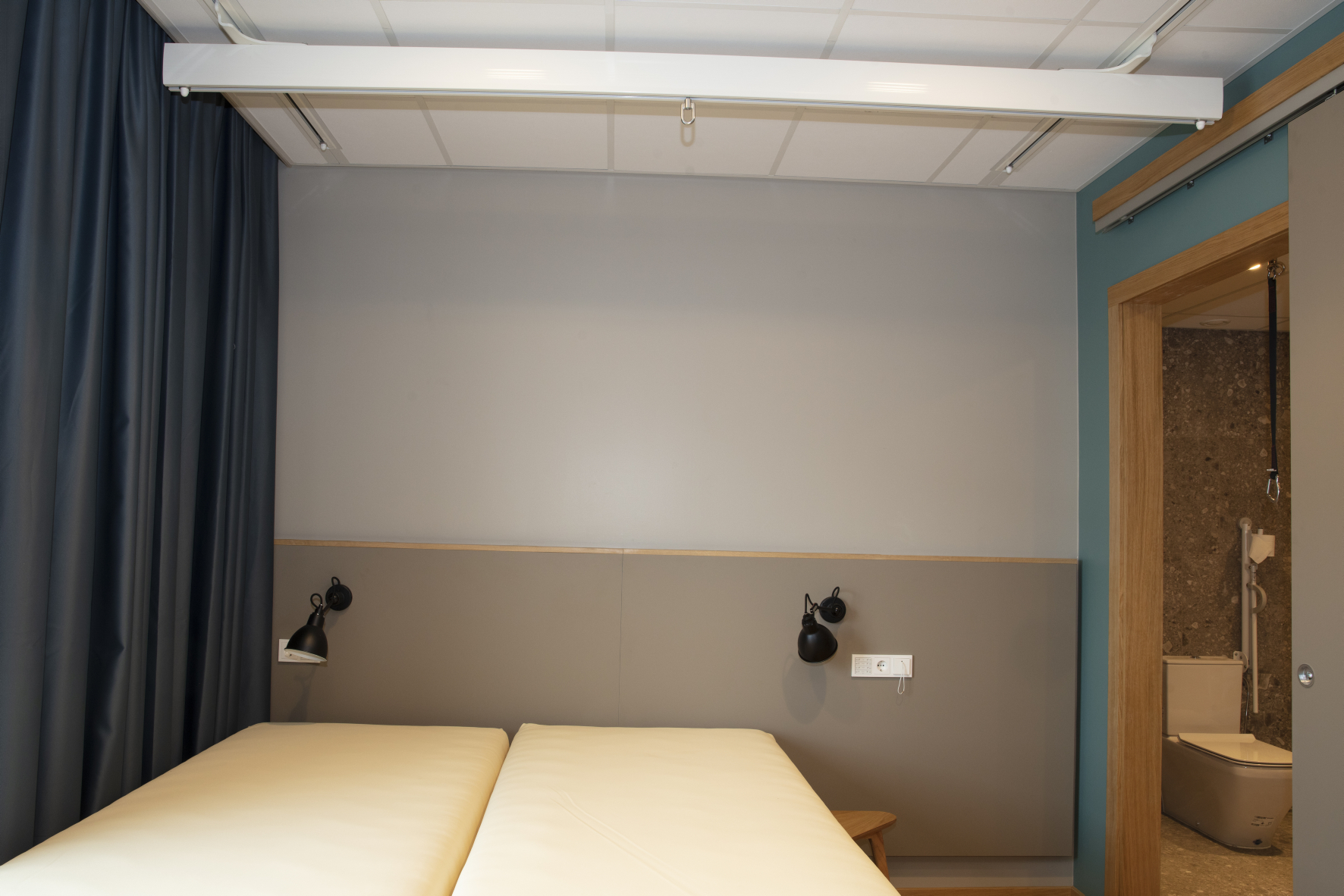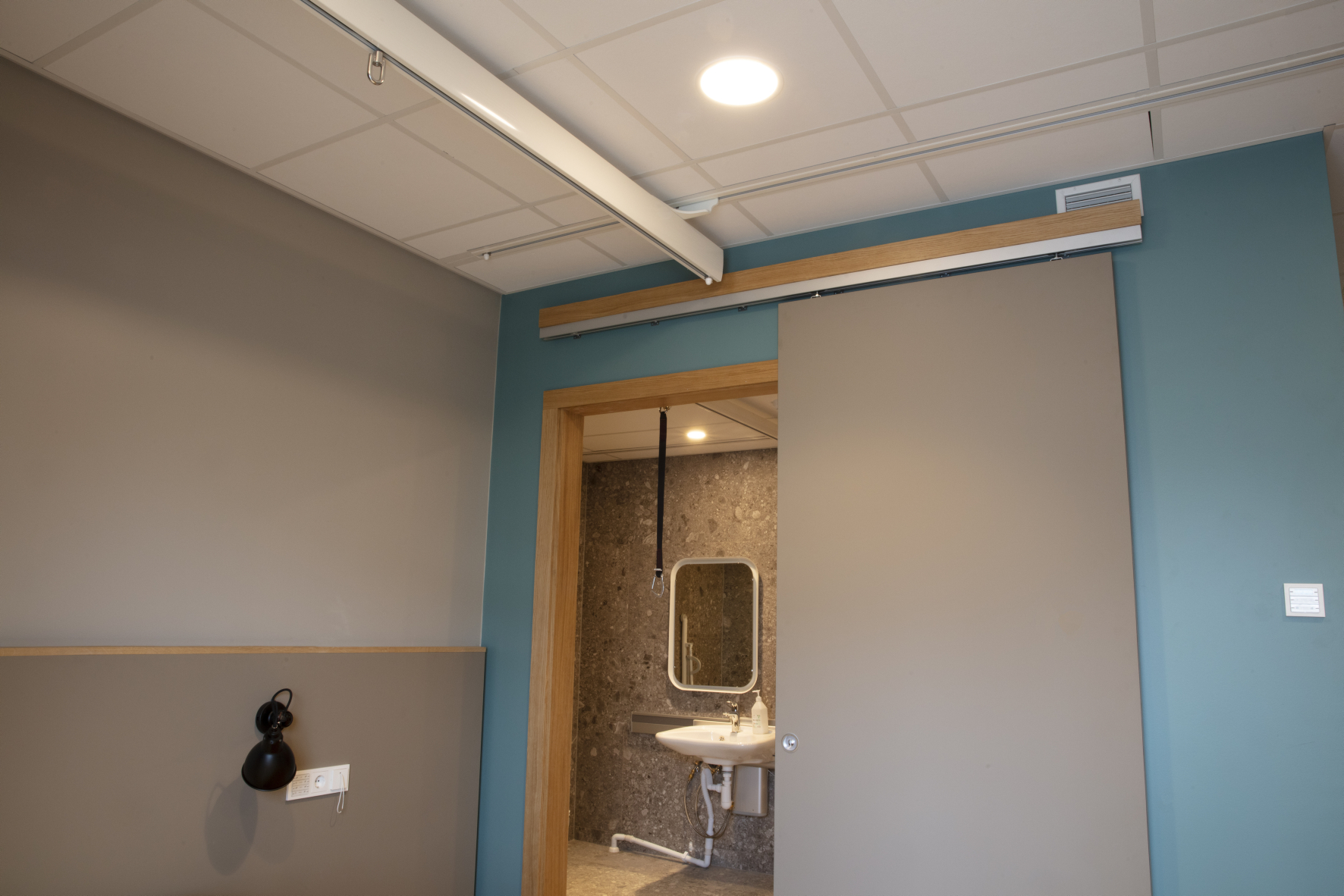 Sérútbúið sjúklingaherbergi með lyftu á milli rúms og baðherbergi:
