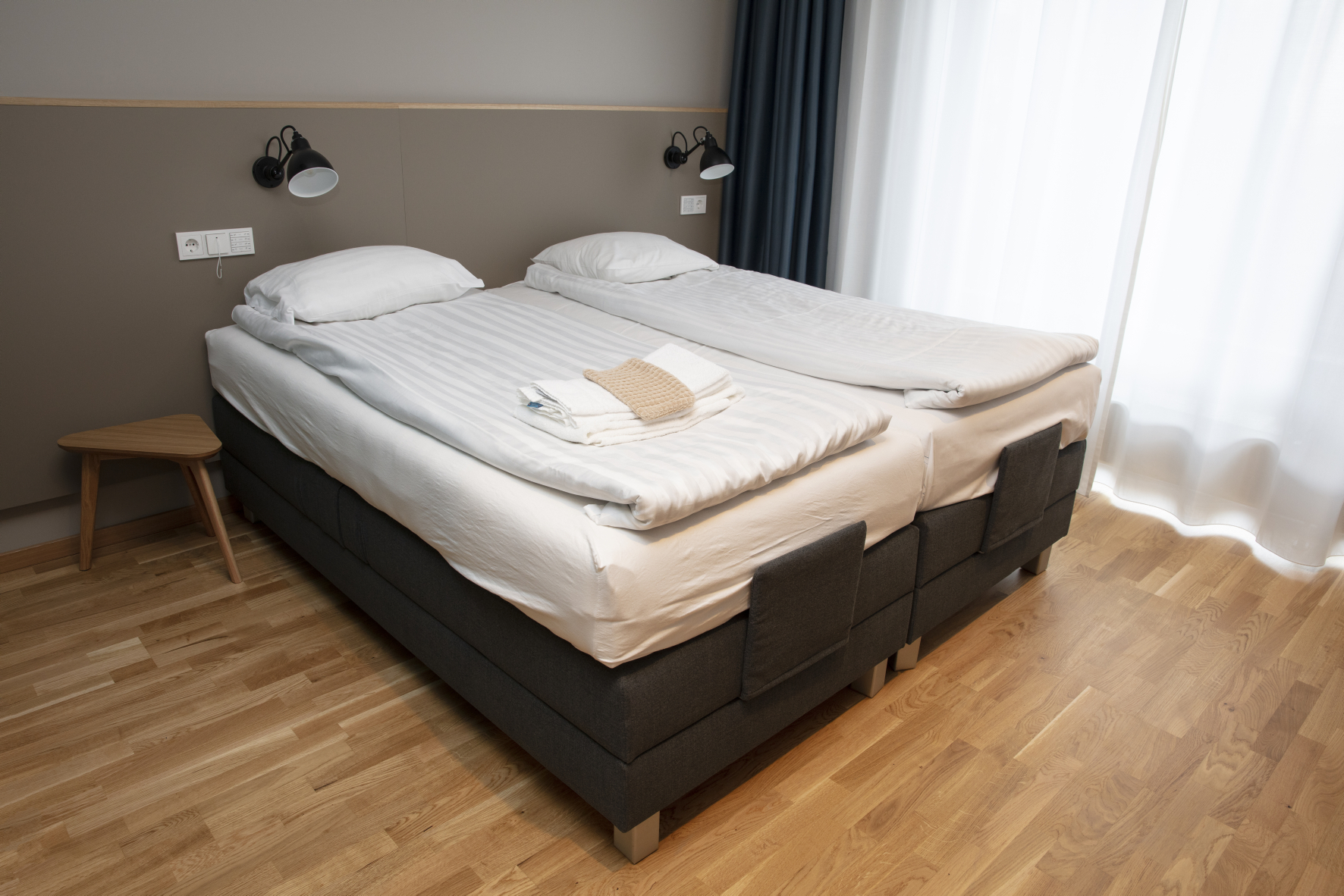 Í hverju herbergi eru tvö einbreið rúm sem hægt er að festa saman eða hafa aðskilin. Hægt er að óska eftir auka bedda, rimlarúmi eða vöggu.