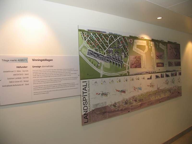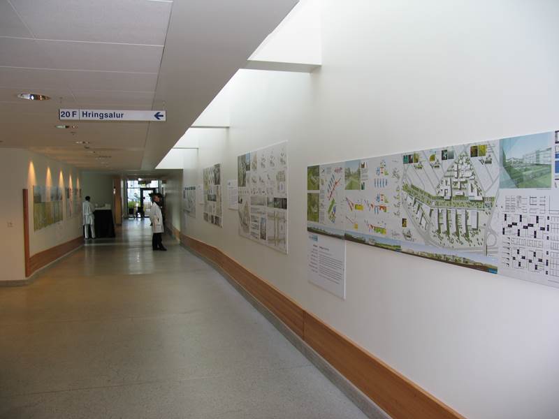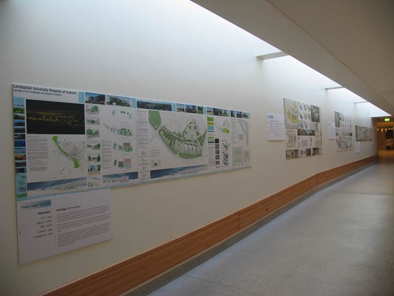 Framan við Hringsal hafa verið hengd upp veggspjöld með tillögunum sjö í samkeppninni um deiliskipulag á lóð LSH við Hringbraut vegna byggingar nýs spítala þar.