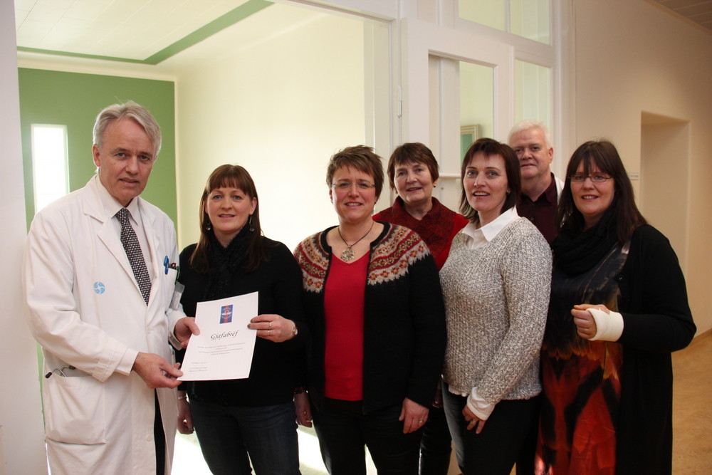 Á ljósmynd: Eiríkur Jónsson, Jóhanna Hreinsdóttir, formaður Kvenfélags Kjósarhrepps, Anna Björg Sveinsdóttir, Hulda Þorsteinsdóttir, Sigríður Klara Árnadóttir, Guðjón Haraldsson og Katrín Cýrusdóttir.