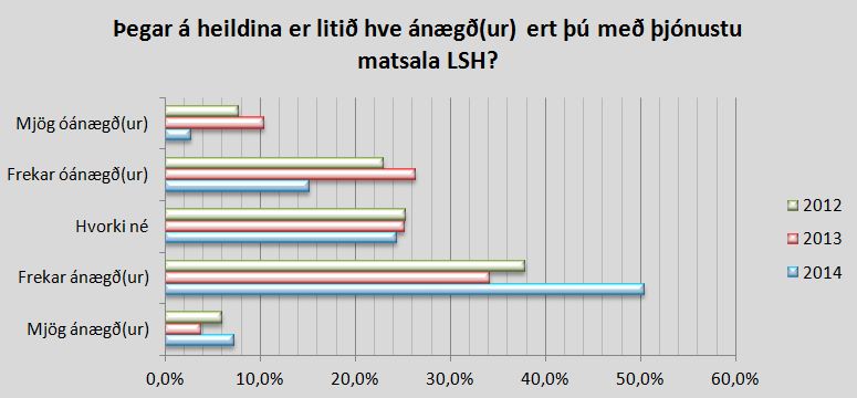 Ánægja starfsmanna með matsali Landspítala hefur aukist um 50% frá 2013 til 2014, samkvæmt niðurstöðu þjónustukönnunar sem send var öllum starfsmönnum með netfang. Alls svöruðu 1.275 af 4.448 eða 28% starfsmanna.