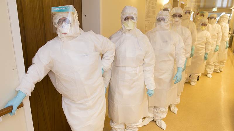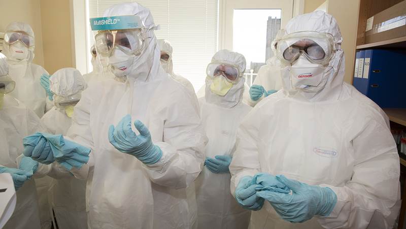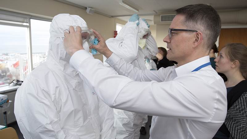 Mynd: Viðbragðsteymi Landspítala á námskeiði vegna undirbúnings fyrir ebólu 31. október 2014. Allir fullklæddir