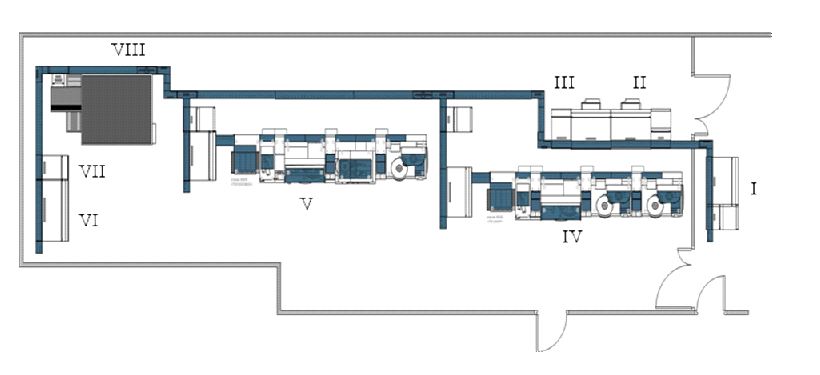 Flæðilína á rannsóknarkjarna Landspítala - Einfölduð teikning af tækjabúnaði fyrir for- og eftirgreiningarfasa og rannsóknartækjum. Mismunandi einingar heildarsamstæðu: I) inn- og útgangseining, II) skilvindur, III) aftöppunareining, IV) rannsóknartækjasamstæða A V) rannsóknarsamstæða B, VI) pípettuþjarki, VII) töppunareining, VIII) kæliskápur.