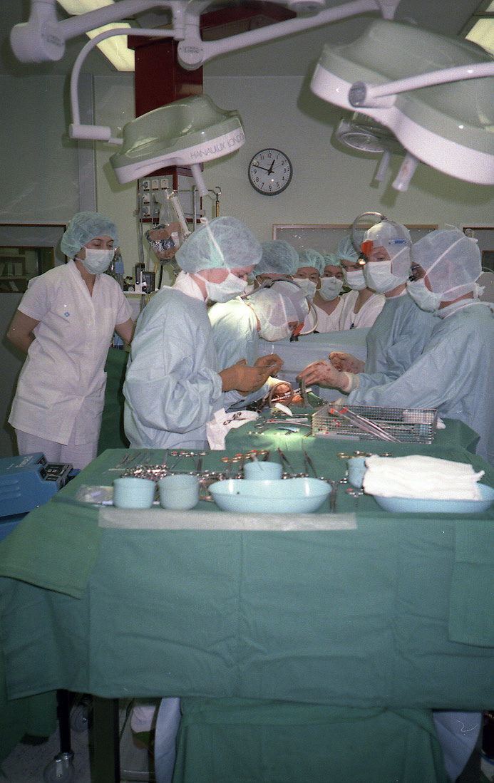 Mynd úr fyrstu hjartaaðgerðinni með hjarta- og lungnavél á Íslandi, tekin laugardaginn 14. júní 1986 á Landspítala. Mynd: Rannveig Þorvarðardóttir.