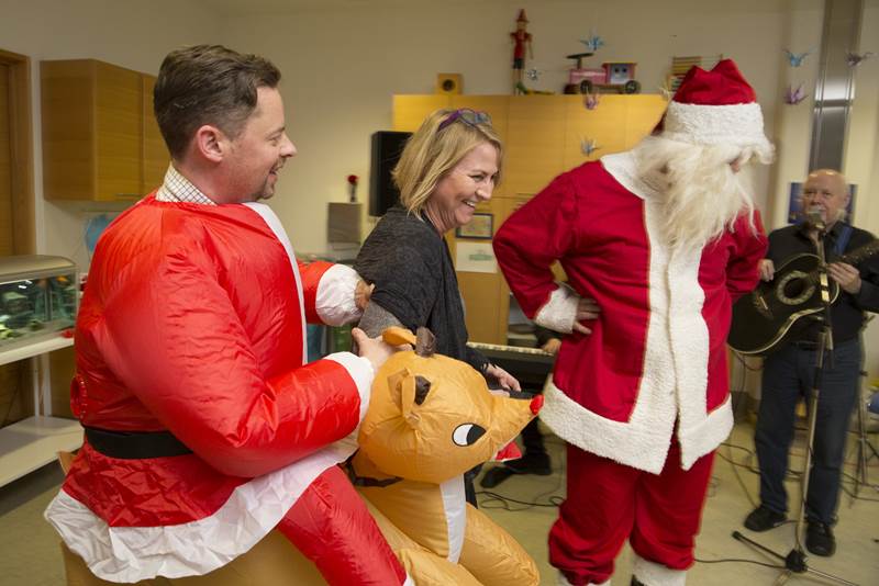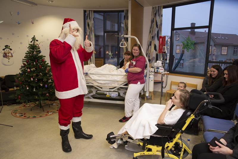 Þórir hljómborðsleikari og Viðar gítarleikari og söngvari voru mættir á jólastundina á leikstofunni eins og þeir hafa gert 6 undanfarin ár. Jólasveinninn fór líka mikinn með Vigfúsi prest á barnaspítalanum sem meðhjálpara. Sveinki átti að vísu svolítið bágt þannig að hann þurfti á læknishjálp að halda. Fleiri starfsmenn og stjórnendur á barnaspítalanum brugðu sér í hinum ýmsu hlutverk og börnin og aðstandendur þeirra skemmtu sér hið besta. Hringskonur buðu svo á eftir upp á hressingu.