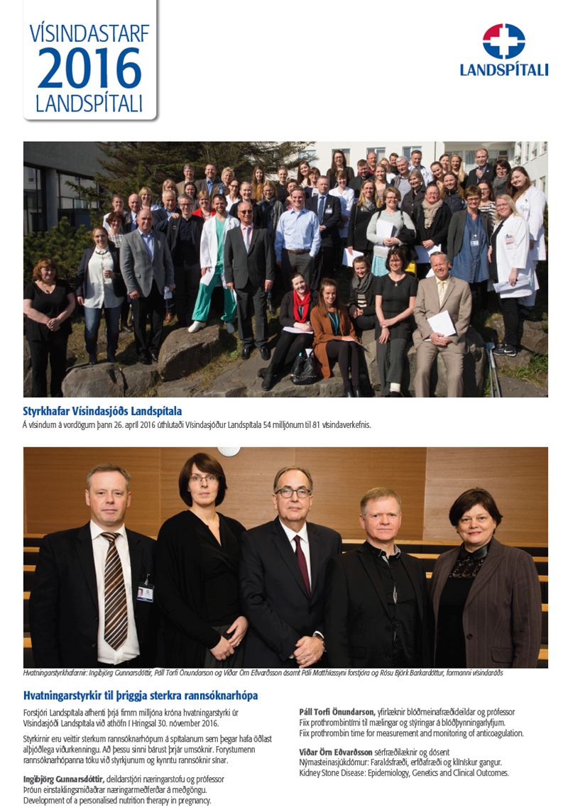 Vísindastarf á Landspítala 2016 (pdf) hefur verið gefið út í tilefni af Vísindum á vordögum 2017, árlegri kynningu á vísindastarfi í Landspítala. Þar er með texta og talnaefni brugðið upp mynd af vísindastarfi á spítalanum á árinu 2016.