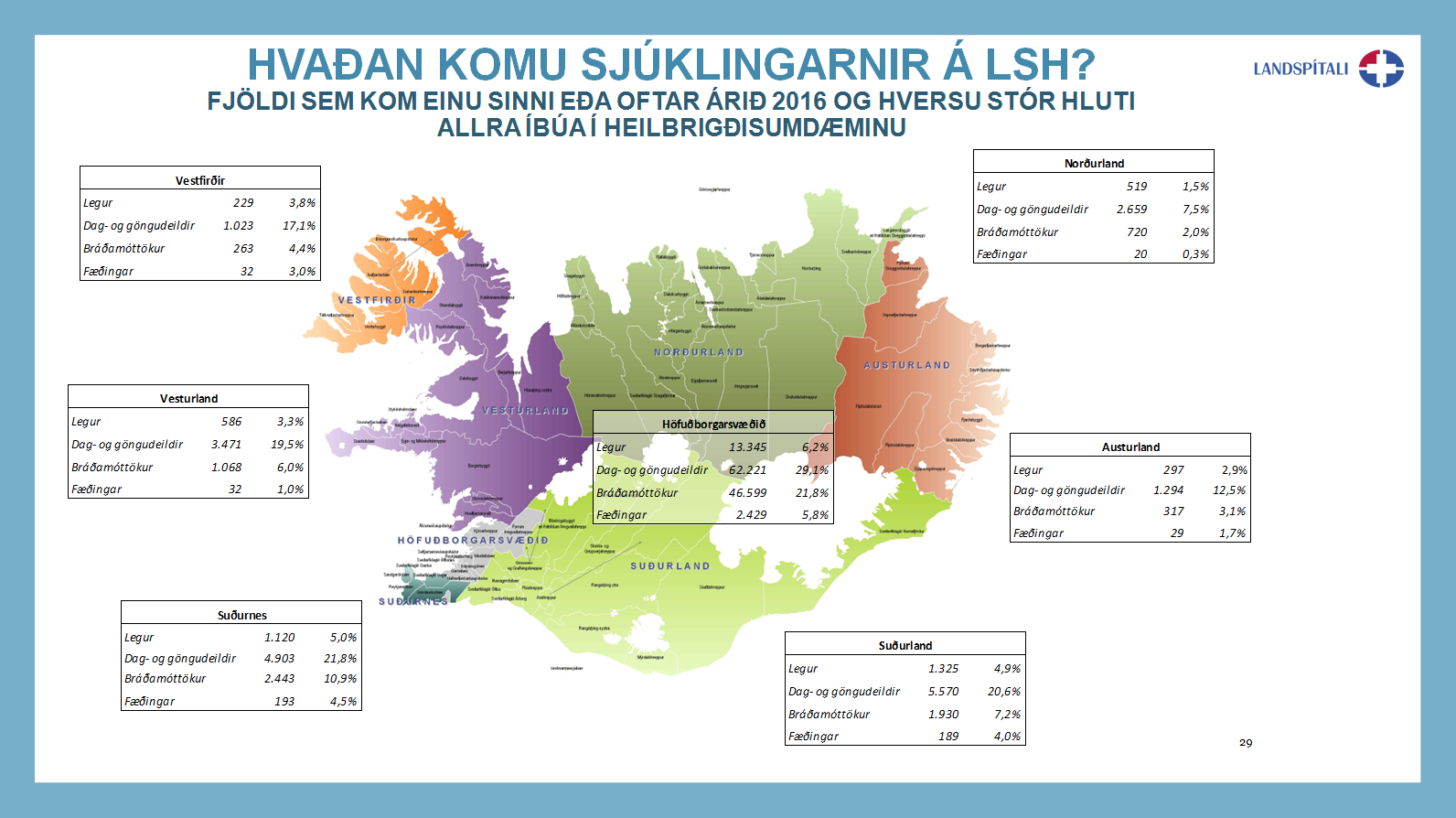Landspítali eins og hann er í dag er afurð fjölmargra sameininga heilbrigðisstofnana; Borgarspítala, Landakots, Landspítala og St. Jósefsspítala svo eitthvað sé nefnt. Landspítali er öflugasta heilbrigðisstofnun landsins, spítali allra landsmanna og þjóðarsjúkrahús. Til okkar leitar fólk af öllu landinu (pdf) og við tökum það hlutverk okkar mjög alvarlega. Á sama tíma og við þjónum landsmönnum öllum um sérhæfða sjúkrahúsþjónustu erum við líka héraðssjúkrahús þeirra sem á höfuðborgarsvæðinu búa. Um landið allt er keðja slíkra héraðs- eða umdæmissjúkrahúsa sem gegna slíku hlutverki gagnvart íbúum á viðkomandi svæðum. Þetta er mikilvægt að hafa í huga og af þessu tilefni er gaman að geta þess að í gær, 28. september, voru einmitt 50 ár frá því að héraðssjúkrahús Reykvíkinga, Borgarspítalinn, tók til starfa. Um þá áhugverðu sögu má fræðast í ágætri grein sem birtist í Læknablaðinu (pdf) á 100 ára afmæli þess. Borgarspítalinn var þó ekki einungis héraðssjúkrahús því þar þróaðist einnig sérhæfðari starfsemi í samræmi við þarfir og nýjungar í heilbrigðisþjónustu.