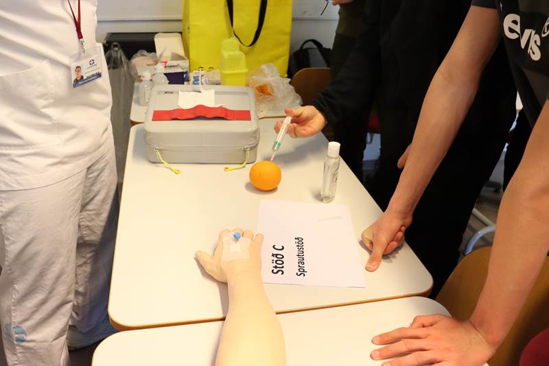 Kynningarnar í skólunum byggja á stöðvaþjálfun þar sem strákarnir fá að kynnast störfum hjúkrunarfræðinga og sjúkraliða á skemmtilegan hátt.