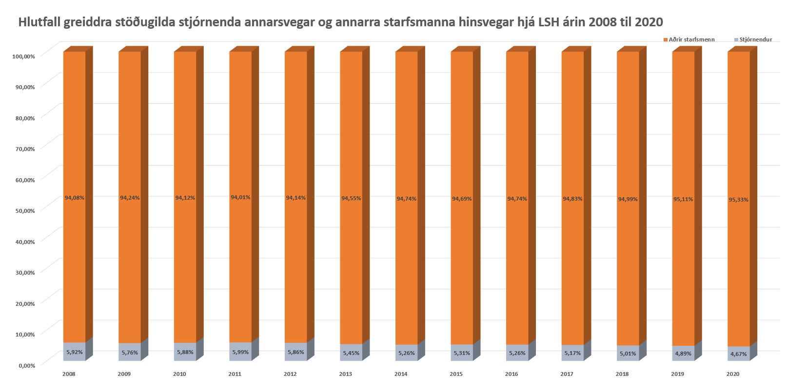 Fjöldi stjórnenda hefur staðið í stað á spítalanum, eða fækkað lítillega, á meðan öðrum starfsmönnum, framlínufólki og öðrum, hefur fjölgað nokkuð (sjá meðfylgjandi mynd). Hlutfall stjórnenda (klínískra og annarra) af fjölda hefur lækkað jafnt og þétt undanfarinn áratug. Stjórnunarspönn stjórnenda (fjöldi starfsmanna pr. stjórnanda) á Landspítala er ein sú stærsta sem þekkist á Íslandi og þó víðar væri leitað